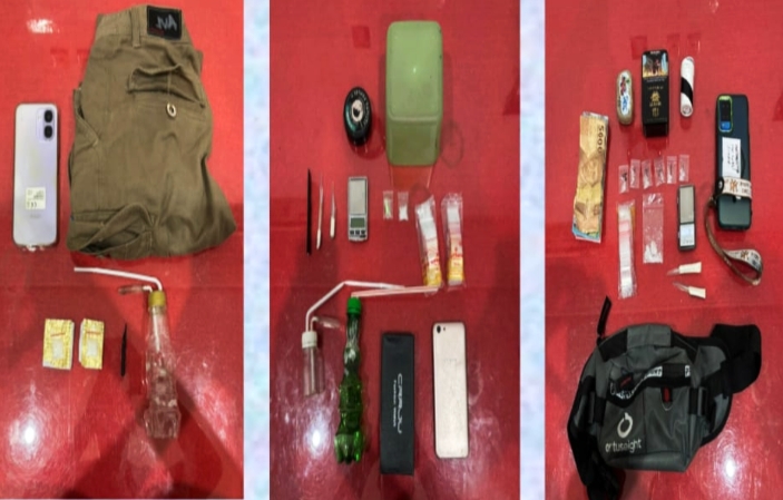 Lebih lanjut, saat dilakukan upaya hukum melalui penggeledahan rumah, Petugas mengamankan tiga orang pria masing masing berinisial S (35), P (36), W (34). Dari pelaku S, Petugas mengamankan barang bukti berupa 1 buah timbangan digital, 3 buah pipet sendok sabu, 2 buah alat hisap, 1 buah handphone, ½ butir pil ekstasi dengan berat total 0,38 Gram brutto, dan 1 kantong klip plastik transparan kecil berisi serbuk kristal diduga sabu dengan berat 0,59 gram brutto. Dari tangan pelaku P, petugas menyita barang bukti berupa 1 buah pipet sendok sabu, 1 buah alat hisap sabu, serta 2 kantong klip plastik berisi serbuk kristal diduga sabu dengan berat total 1,82 gram Brutto. Sedangkan dari tangan pelaku W, petugas menyita barang bukti 1 buah timbangan digital, 2 buah pipet modifikasi sendok sabu, 1 buah handphone, 1 buah tas selempang, uang tunai Rp. 720.000, serta 7 kantong klip transparan berisi serbuk kristal diduga sabu dengan berat total 3,63 gram Brutto.